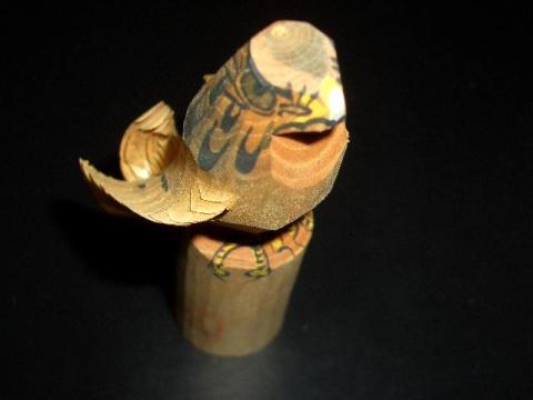 コシアブラの丸木を、サルキリと呼ばれる刃物で削り、簡単な彩色を施す。