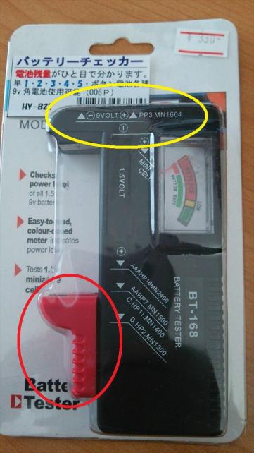 そして黄色丸の部分に角電池専用の端子がある、そこにくっつけることで計測ができる仕組みになっています。