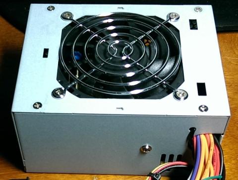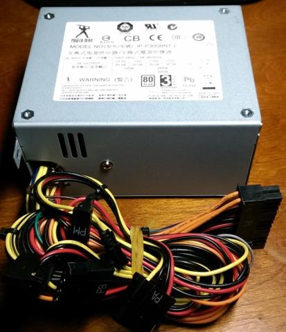 ケーブルはメイン24pin、12V4pin、SATA-大4pin、SATA-大4pin-FDDとちょっと古くさいが300Wで80PLUS認証と980円でこれが動けば大儲けだ。