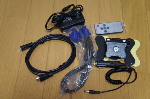 付属品は、スタンド、リモコン、シガーソケット電源、家庭用電源、VGAケーブル、HDMIケーブルです。