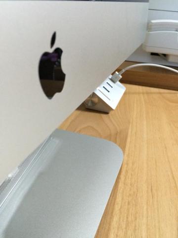 下の画像ではiMacの真下に設置してありますが、ケーブルやUSBメモリを挿した時に前面の傾斜のおかげで本体とぶつからないという利点があります。