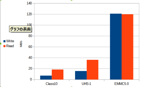 eMMC 5.0ストレージの速度は、高速なMLC UHS-Iカードよりも書き込みは8倍弱、読み込みは3.3倍速いですね、グラフにしてみました。
