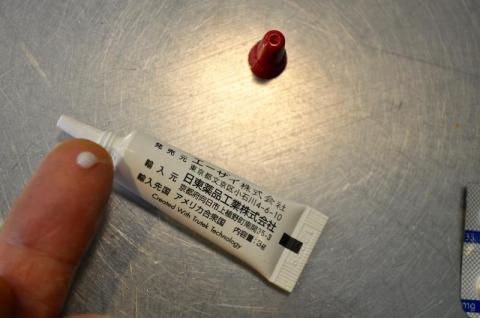 チューブを少し押して、細いノズルから軟膏(ジェル)を出しますが、その量はゴマ一粒分程度。0.02g。