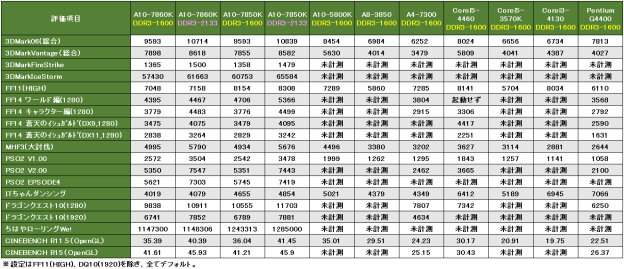 A10-7850Kのみ、今回のレビューの合わせて、最新のドライバでベンチをすべて取り直しました。また、一部のAPUのみDDR3-1600と2133の両方で測定しています。