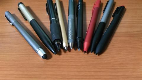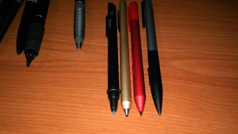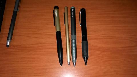 左から2本目が本製品ですが、単4電池搭載のタッチペンと比べると軸が細くて軽いです。