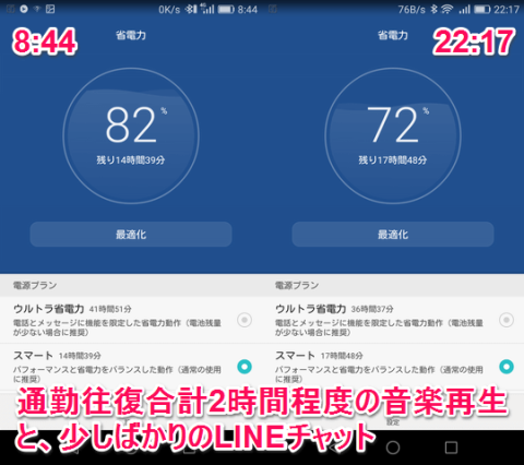 通勤往復合計2時間程度の音楽再生と、少しばかりのLINEチャットくらいならバッテリー消費も知れているようです。
