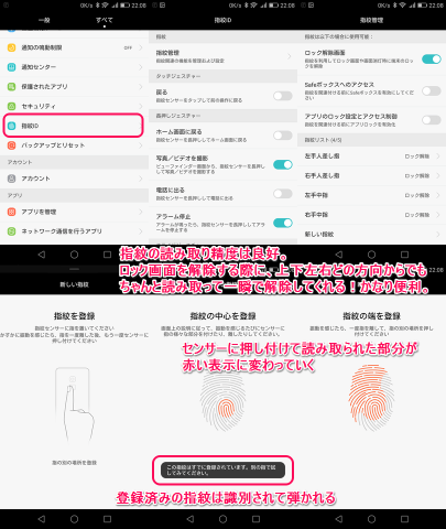 指紋の登録も簡単だし、指一本でスリープ状態からアプリを起動する事も可能です。