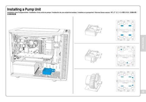 - 内部のマルチブラケットにあらかじめ用意されている穴は、DDC および D5 系をサポート (より詳しい説明はマニュアルをご覧ください。)