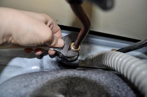 このタイプの水栓の場合は、水栓コマを替えるにも、鶴口を替えるにも一般サイズのモンキーレンチは適合しないのでウォータープライヤーを別途用意する必要があるのですが、洗面シンク裏に備わる2種類のナット口径には、そのモンキーレンチが使えました。