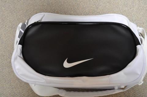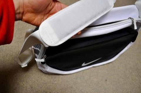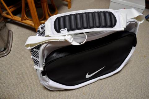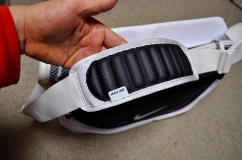 ショルダーベルトは白で、肩にあたる部分に独立したエアチャンバーを持つNIKEマックスエアストラップが配されます。