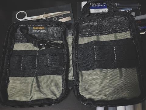 元々はミリタリーやアウトドアギアのこれは、ナイフやライト、ファーストエイドのアイテムを収納して過酷な条件下で使われるために作られている。