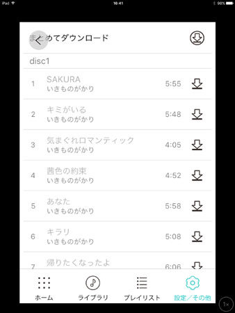 320kbpsで60曲全てダウンロードするとアプリを含めて861MBのディスク容量になりました。