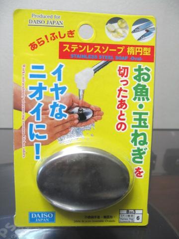 フェレンギさんが、昨日 持ち物登録した、ステンレス・ソープを見て、世の中には、摩訶不思議なものもあるんだな?と、早速購入してきました 100均で脱臭剤コーナーで探したけど判らなかったので、店員さんに聞いてみました うら若き女性に、だんまりで案内していただきました(>_<) 無言でスタスタ行っちゃうし.. 場所は台所用品のブラシ等の場所でした 実物は卵型ですが平たいです。