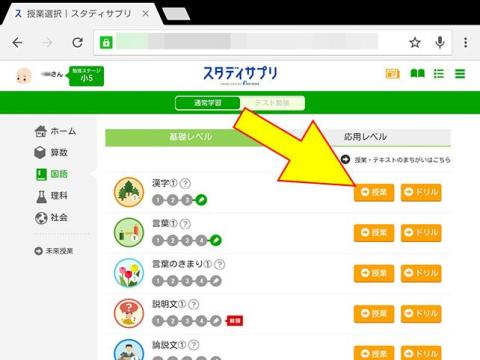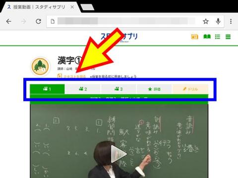 青い線で囲まれた部分のカメラの画があるタブが授業になっており、授業の確認問題(ドリル)が一番右のタブにあります。