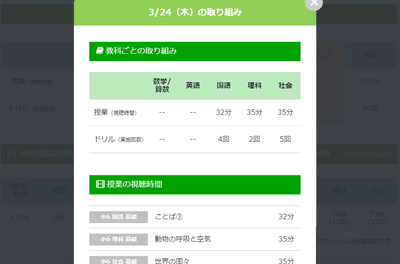 授業とドリルそれぞれ、どの教科をどれだけ利用したのか判るようになっているので、余りにも偏った教科ばかりやっているようなら、やっていない教科をやるように促したりするのは親の役目ですね。