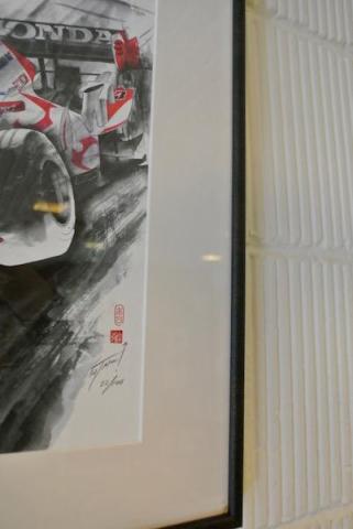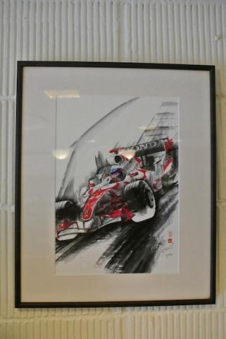 これはSA06スーパーアグリを駆る佐藤琢磨選手を描いた、垂井ひろし師の炭版画です。