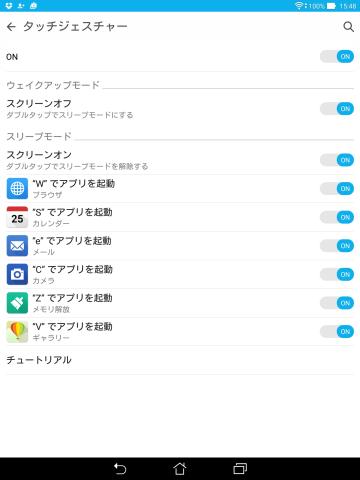 さらにZenMotionではスリープ状態の画面上で特定の文字を書くことで、指定されたアプリをクイック起動するという機能も実現されています。これは「タッチジェスチャー」と呼ばれるもので、現状では出荷状態で以下のように割り当てられています。