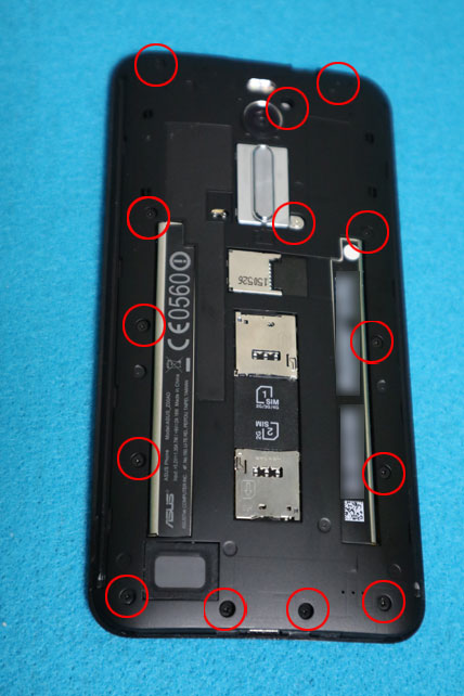 まずは、13+1箇所のネジをはずします。1箇所はカメラ横のシールの下に隠れているので注意…。黒ネジ13本、銀が1本です。