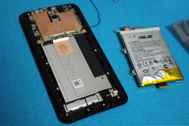 あとは、バッテリーの裏面に両面テープで貼り付けられている「SIMスロット」と「MicroSDスロット」パーツも、これもそーーーっとはずして、新しいバッテリーに移植します(またも写真撮り忘れ)。