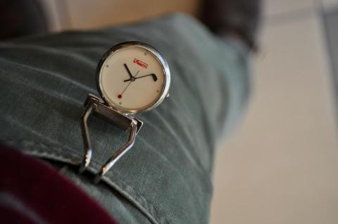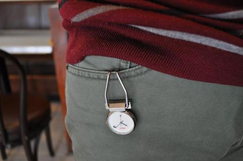 腰骨付近に装着しておき、必要な時に起こして時刻を確認するようにデザインされていました。