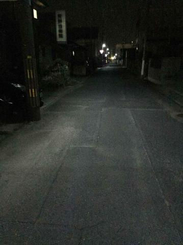 手前の止まれの標識と、その先の駐禁の標識まで照らしています。駐禁の標識までの距離は、約250mぐらいあります。