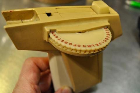 手元にある製品は、ピストル型で、引き金を引く事でダイヤルに刻まれた刻印がテープに転写され、引き金を緩める時にテープが先に送られます。