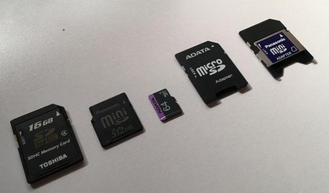 大きさ比較のためSDカード、miniSDカード、microSDXCカード、アダプターを