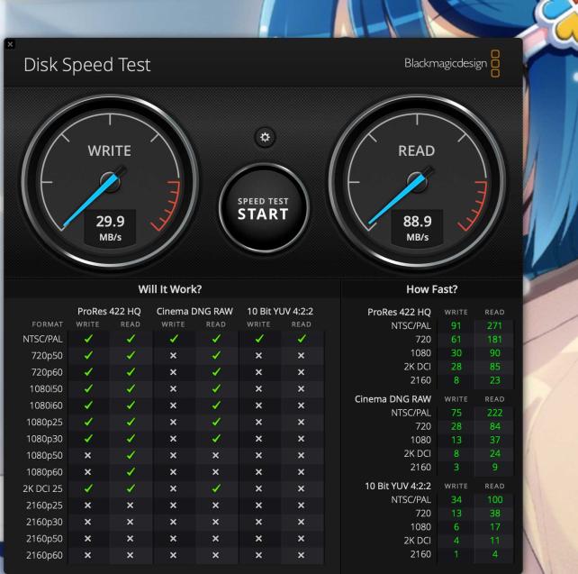 案の定数倍速い結果が出ましたREADで88.9MB/s WRITEで29.9MB/s