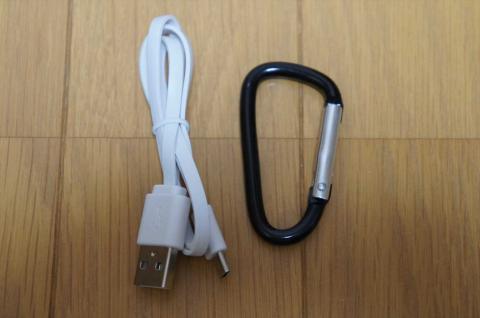 充電用のMicroUSB-USBケーブルとカラビナフックが付属しています。