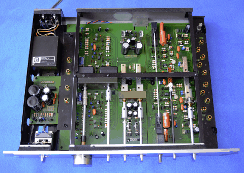 左は電源部 真中上下 定電圧レギュレータ 中央左の黒四角は音量ボリュームとバランスボリューム