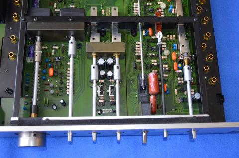 回路は左右チャンネル信号漏洩阻止するため、左右信号専用ルートということで、入力端子から出力端子まで1直線?仕様です。 回路の切り替えなどはスイッチとジョイントシャフトが使われています 回路基板上にロータリースイッチを設け、前面からシャフトで切り替える方式をとっています その点にお金が掛かっています。