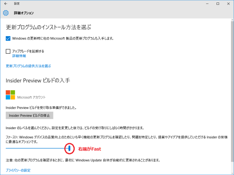 「設定」-「更新とセキュリティ」-「Windows Update」-「詳細オプション」に有る、目盛を一番右にスライドし「ファースト」に設定します。