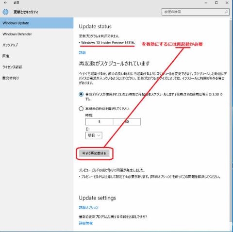 「Build14316」を有効にするには再起動が必要で再起動します。