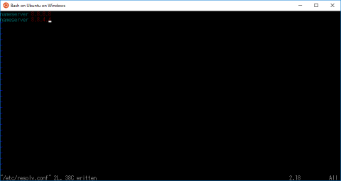 見辛いですが、「nameserver 8.8.8.8」と入力し「Enter」キーを押し、次に「 nameserver 8.8.4.4」と入力します。