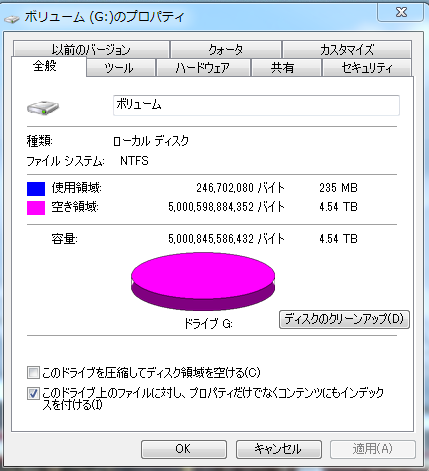 実際に接続して、フォーマットしてみました。表示上は5TBですが、実際に使用できるのはその9割で4.5TBになります。エラー等も出てないですし、何も問題はなさそうです。