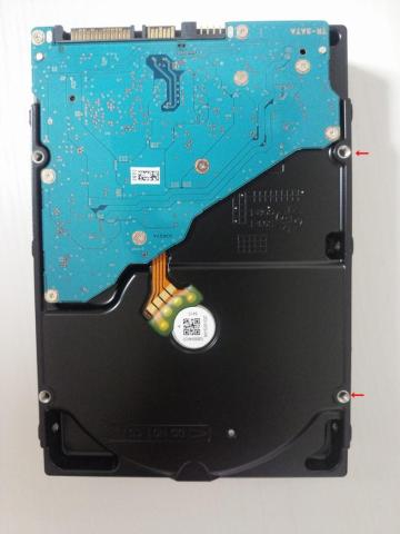 裏面です。写真右側に赤の矢印があるのがねじ止め位置ですが、これ今までのHDDよりも広めです。実際にケースにつけるときに、片側しか止められませんでした。側面のねじ穴は普通の規格なので問題ないですが、裏側の穴は要注意です。