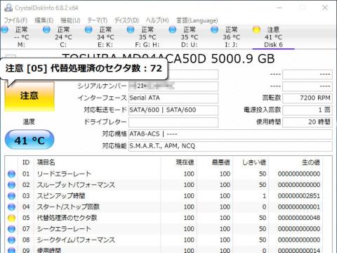 代替え処理済みのセクタ数が黄色くなっていました、数は「48」!