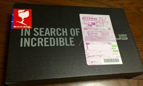 おなじみASUS箱に伝票直張り。ノジマさんは梱包の加算をすればもっといい梱包になります。