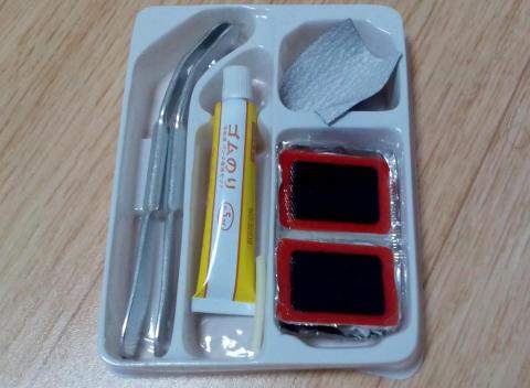一通りそろっています。虫ゴムまで入っているとは親切ですね。パンク修理をはじめて行う人はタイヤ脱着工具が3本あるとやりやすいので2組買った方がよいかもしれません。
