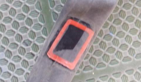6.パッチ(バンソーコーみたいなやつ)をアルミの台紙からはがし、先ほどの穴とゴムのりの乾燥させた部分に貼り付ける。