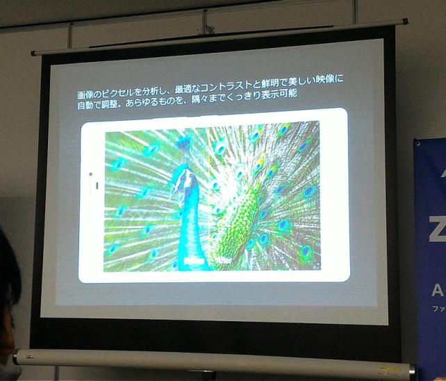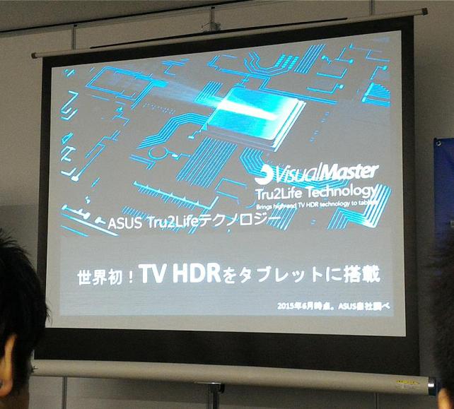 プレゼンテーションによると、ASUS独自の映像テクノロジー“Tru2Lifeテクノロジー”により、画像のピクセルを分析し、最適なコントラストに自動調整してくれるので、鮮明で美しい映像が楽しめる。HD(1280×800)であっても、フルHD(1920×1080)と遜色なく綺麗に見えるという。