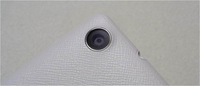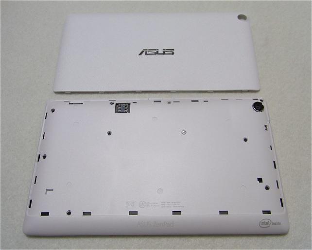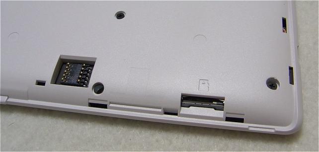 裏面は大部分にシボ加工が施されている。指掛りが良く、滑り止めの効果もある。クラッチバックをイメージしたデザインということらしい。先程の外周部分の加飾にしても、低価格帯の製品の割にはデザインに気を使っていることを伺わせる。このシボ加工が施されている部分はカバーになっており、取り外せるようになっている。カバーを外すとmicroSDカードスロットがある。