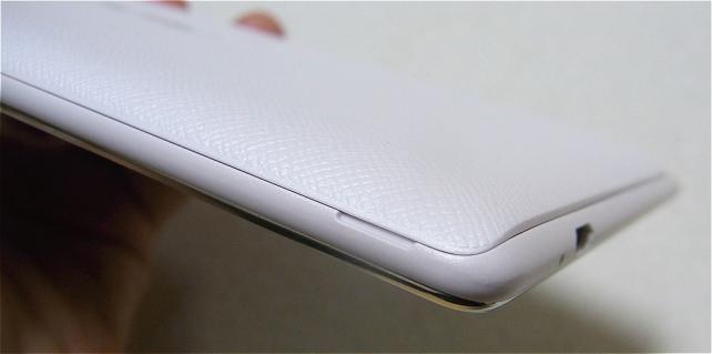 裏面のカバーを外す時に使う溝。電源ボタンがある側面の隅にある。ここに爪を入れて、カバーを軽く浮かせてから電源ボタンの方向へ爪をぐっとスライドさせるとパカッと外れる。このカバーは外しにくいと不評のようだが、簡単に外すことができるなというのが個人的な見解ではある。というのも、カバーの強度がそこそこあるので、力を入れても破損する心配がないからだ。