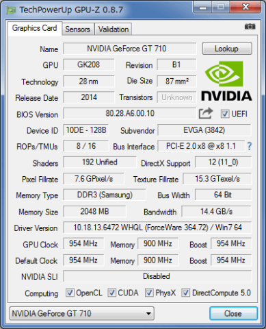 ただ1点面白いのがGT720との関係。GT720とGT710はほぼ同じスペックなのだが何故かGT710の方がGPUクロックが高く設定されている(GT720:797MHz/GT710:954MHz)。