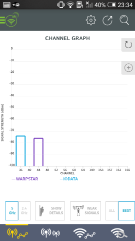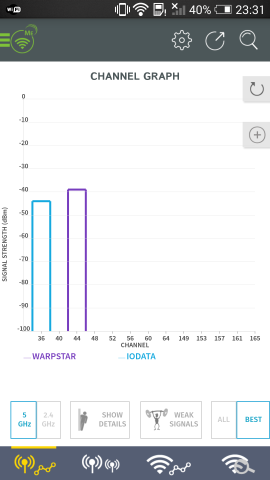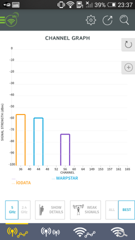 自室からは押入れと風呂場を挟んでしまうため5GHz帯だと届いたり届かなかったりだったが、休日日中の電波が空いてる時間に検証を行ったせいかどちらも無事届く。というか知らないお家のまで拾ってしまったので色がズレた・・・