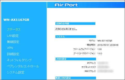 検索するとWN-AX1167GRが見つかるので、ブラウザボタンを押すと設定画面が開きます。