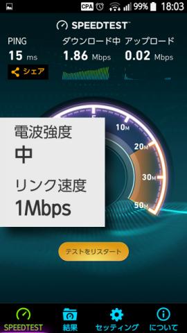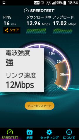 1階に行くと電波はもうかろうじてつながっている状態で、リンク速度も激減、スピードテスト結果もそれに準じた速度になっています。