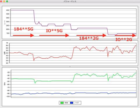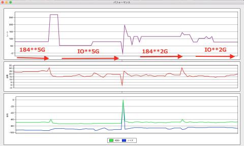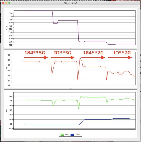 同じappで「パフォーマンス」ウインドウを開き、wifi接続を切り替えながらの計測です。