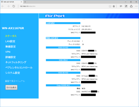 差し替えてからWX-AX1167GRの管理画面を確認します。MACアドレスなどは一部隠しています。