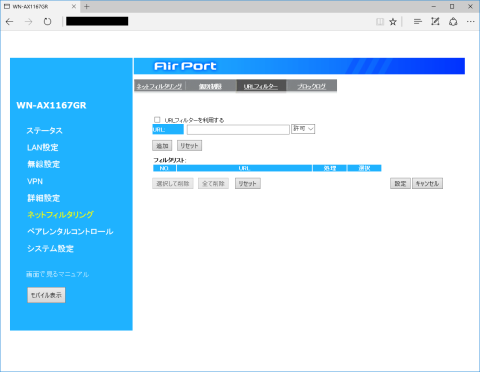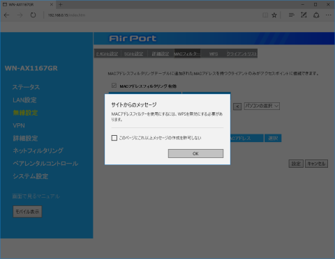 MACアドレスフィルターを使用するにはWPSをOFFにするようにとあります。ATermでは、WPSを使うときは、MACアドレス制限リストにあらかじめリストに登録する必要がありました。MACアドレス制限リストにない機器は自動登録できませんが、手動で登録できます。WN-AX1167GRでは、MACアドレスフィルターをONにするときはWPSをOFFに設定しないといけないように(画面UI上は)見えます。MACアドレスフィルターをONにする際にWPSを切るのはいいにしても、その後新しい機器を追加するためにWPSをONにすると、MACアドレスフィルターの設定が保持されているのか心配です。
